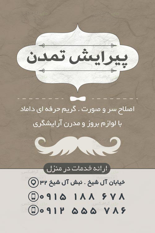 این فایل لایه باز PSD کارت ویزیت ارایشگاه مردانه با بقیه کارت ویزیت های ارایشگاه مردانه از نظر پس زمینه فرق میکند.در پس زمینه این کارت ویزیت شما متوجه طراحی و ساخت بی نظیر ان می شوید.همینطور در کادر ان میتوانید به راحتی از تمامی امکانات ان با خبر شوید.مشاهده فایلهای مشابه در همین سبک : کارت ویزیت آرایشگاه مردانه psd