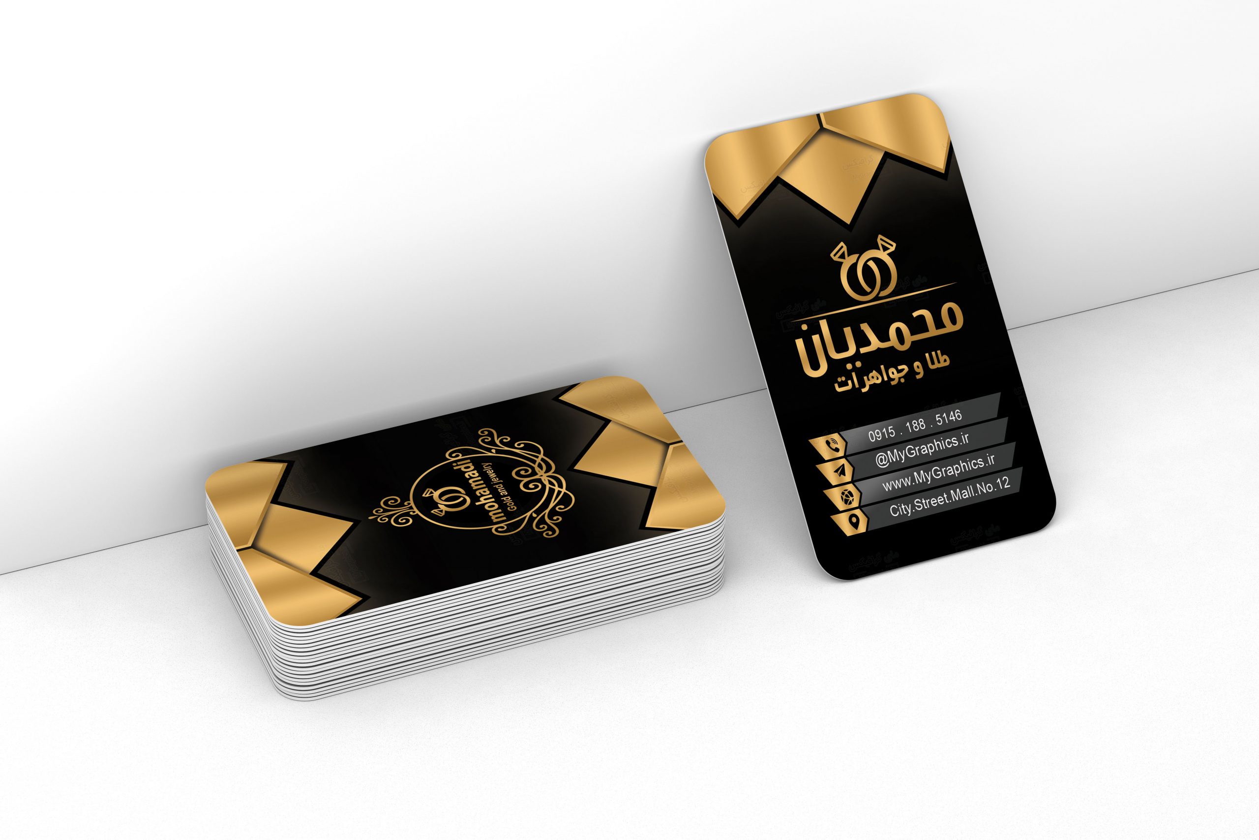 فایل PSD لایه باز کارت ویزیت طلا و جواهر فروشی با رنگ مشکی طلایی